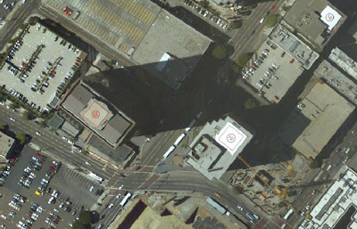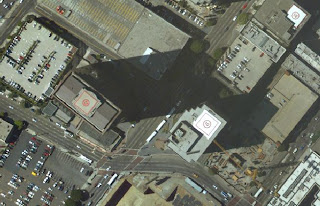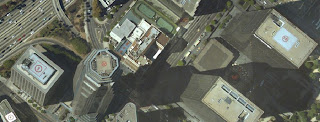 This next image shows what a "true ortho" would look like (a different part of central LA). The only way to tell the buildings are highrises, other than the giveaway helicopter landing pads, is the long shadows cast by the two buildings in the center.
